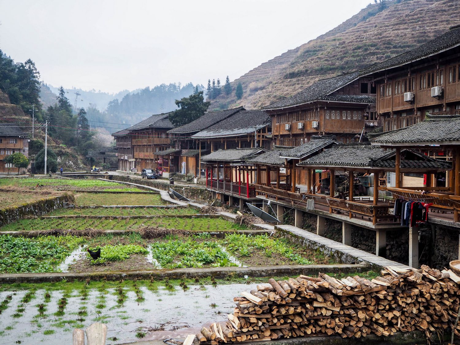 Lorsque nous tirons les rideaux de notre grande fenêtre au petit matin, nous découvrons un paysage splendide, qui ne ressemble à rien de ce que j’ai pu voir jusqu’alors. Des collines s’étalent autour de nous à perte de vue, et les rizières en terrasse modèlent les pentes, les transformant en d’immenses et magnifiques escaliers. Si l’on suit des yeux l’une des terrasses, elle ressemble à un grand ruban déroulé le long des collines. En cette fin d’hiver, le paysage brûlé par la neige qui l’a recouvert plusieurs mois durant a pris une teinte jaune, presque dorée. Je m’égare à imaginer ce paysage au printemps, lorsque les terrasses inondées par la pluie reflètent les couleurs éclatantes du ciel et de la terre.