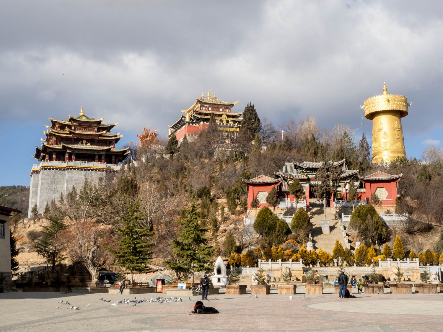 Au cœur de la ville se dresse une immense tour dorée, qui se révèle être un moulin à prières, objet cultuel tibétain. Sur un gigantesque cylindre sont gravées des formules sacrées, et à l’intérieur de longues bandes de papier ou de tissu couvertes de mantras sont enroulées autour de l’axe. Les croyants font tourner le large cylindre sur son axe à la force de leur bras, dans le sens des aiguilles d’une montre, pour laisser s’envoler l’énergie positive et sacrée qu’il contient.