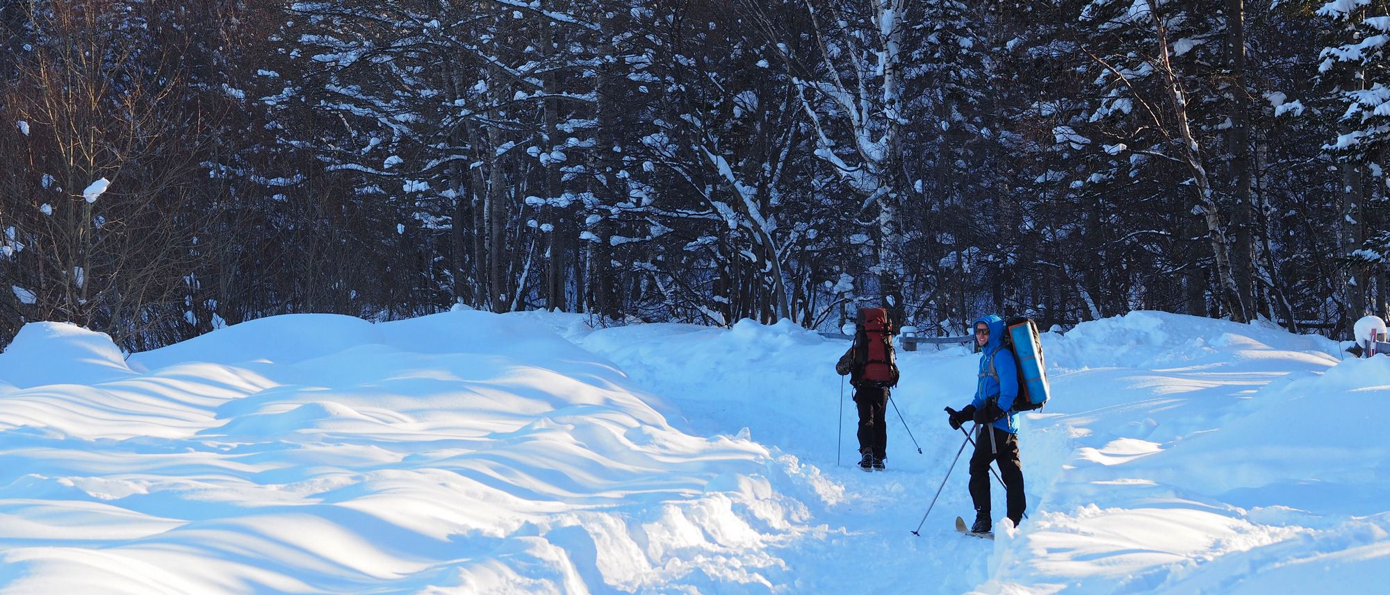 Nous quittons le gîte confiants et heureux de se lancer dans cette nouvelle aventure. Pourtant, bien vite, les infimes reliefs nous donnent du fil à retordre. La neige tassée par les motoneiges qui arpentent ce même chemin est extrêmement glissante sous nos skis recouverts d’une fine pellicule de cire. A la moindre descente, nos spatules glissent à vive allure tandis que nos lourds sacs à dos nous retiennent vers l’arrière, et nous nous retrouvons inévitablement sur le dos, les quatre fers en l’air. Les quelques premières fois, nous nous relevons, hilares, et reprenons notre route. Lorsque la pente est un peu plus raide, afin d’éviter de chuter à pleine vitesse, nous nous jetons dans les murs de poudreuse qui bordent le chemin. Se remettre debout, alors que nous sommes enfoncés dans plusieurs mètres de neige, chaussés de de long skis inflexibles, et lestés d’un bagage de 10 kilos se révèle alors particulièrement pénible, et nous passe rapidement l’envie de rire. Les côtes s’avèrent tout aussi difficiles à aborder, car le poids de nos sacs nous tire vers la pente.