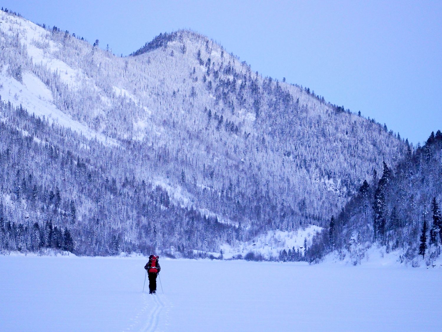 Selon Anton, il nous faudra de longues heures pour parcourir les deux lacs dans ces conditions. Le soleil commence déjà à décliner sur l’horizon. Il suggère un instant que nous fassions demi-tour, mais nous avons déjà skié 5 heures et n’imaginons pas une minute reprendre la route en sens inverse. Nous décidons de contourner le premier lac par ses berges, légèrement escarpées, mais pas inabordables. Lorsque nous atteignons le second lac, les rives abruptes et boisées, ne sont plus une option. Nous devons le traverser. Nous n’avons pas mangé depuis le matin, et je sens mes jambes commencer à trembler. Le lac ne fait que 2,5 kilomètres de long, mais il nous faudra plus de 2 heures pour en venir à bout. Lorsque nous arrivons de l’autre côté, ma jambe droite me fait terriblement souffrir à chaque pas, je suis affamée, et seule l’énergie du désespoir me permet encore d’avancer. Plus d’une heure de route nous sépare encore de la cabane.